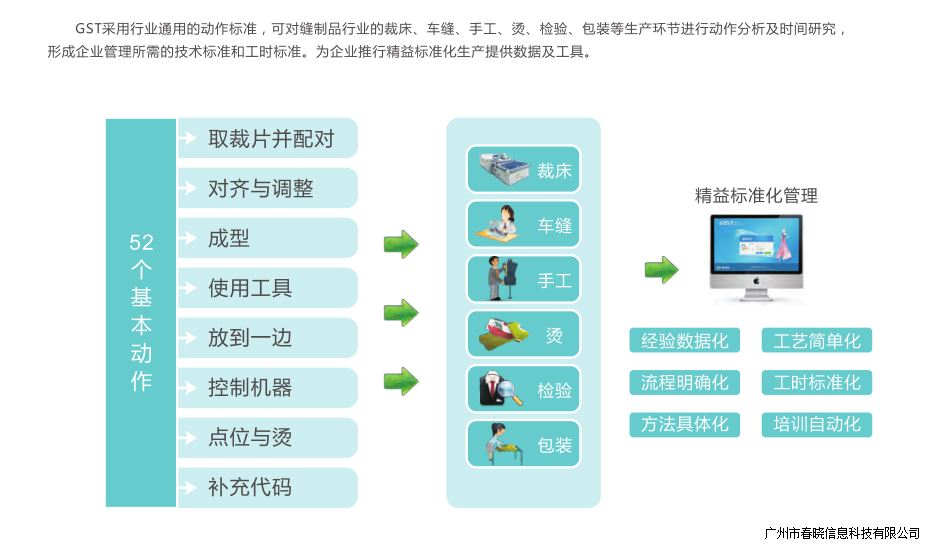 昊天制衣通过引进今年会GST标准化管理系统,实现工时标准化、优化生产工艺流程、实现管理精细化,为业务发展提供更加有力的支撑,发挥业务板块与实业板块之间的桥梁纽带作用。绿色生产,公司把传统产业优势和转型升级结合起来,对客户每一项新需求,新概念,新想法快速作出反应。通过GST标准,将全面管理公司的各种工艺技术标准,以及建立完善的标准工时核算和应用体系,进一步通过对技术人员(IE人员)、管理人员的GST分析培训,逐步深入标准化的应用,推进标准化,自动化,可视化,信息化改善,充分发挥信息技术在生产过程中的作用。